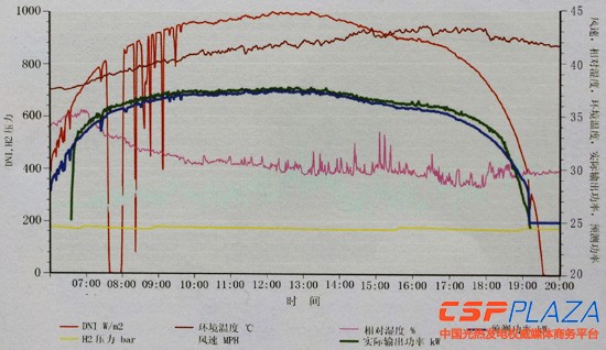 圖:湘電38KW碟式光熱發電系統實測數據(預測功率:KW(藍線))