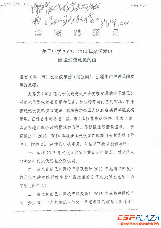 國家能源局為落實《國務院關于促進光伏產業健康發展的若干意見》,明確光伏發電目標和任務,將對中國光伏發電實行年度規模管理,在綜合考慮各省(區、市)太陽能資源條件、電力市場以及各地區配套政策措施和實際工作積極性等因素基礎上,研究提出了2013、2014年度中國光伏發電規模預安排方案。