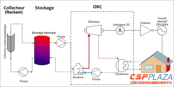 他們利用了有機朗肯循環的工作原理,將商業化應用的太陽能槽式集熱器安裝在家庭院落的空地上,集熱管內充入某種有機工質,加熱工質至400華氏度(204攝氏度),工質進入Apollon系統產生高溫高壓的氣體,氣體推動渦輪機來帶動發電機發電,供應家庭用電需求。在渦輪機的出口,氣體的余熱用于家庭的采暖和熱水供應。
