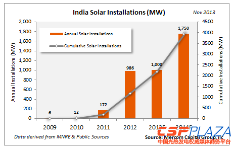 2013年度共完成光熱發電裝機50MW,另有420MW光熱發電裝機未能在規定期限內建成,這些裝機將在2014年陸續建成投運。Mercom Capital預測,2014年印度太陽能發電新增裝機容量將達到1750MW,其中包括420MW的光熱發電。