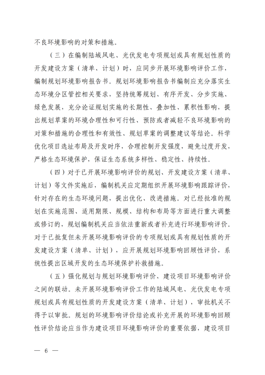 強化單個項目整體性評價。統籌考慮陸域風電、光伏發電建設項目與進場道路、場內道路、送出線路和升壓站(變電站)等配套工程,可統一進行立項、統一開展可研,相關建設內容整體開展環境影響評價,一并“打捆”報送審批,分別明確相應建設項目的環保措施要求和建設單位的環保責任。