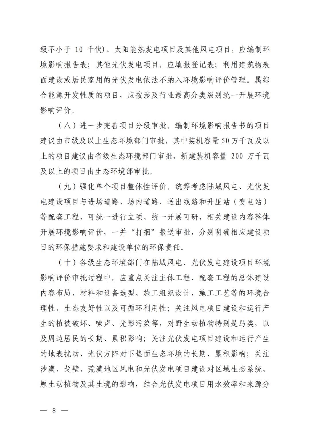 進一步完善項目分級審批。編制環境影響報告書的項目建議由市級及以上生態環境部門審批,其中裝機容量50萬千瓦及以上的項目建議由省級生態環境部門審批,新建裝機容量200萬千瓦及以上的項目由生態環境部審批。