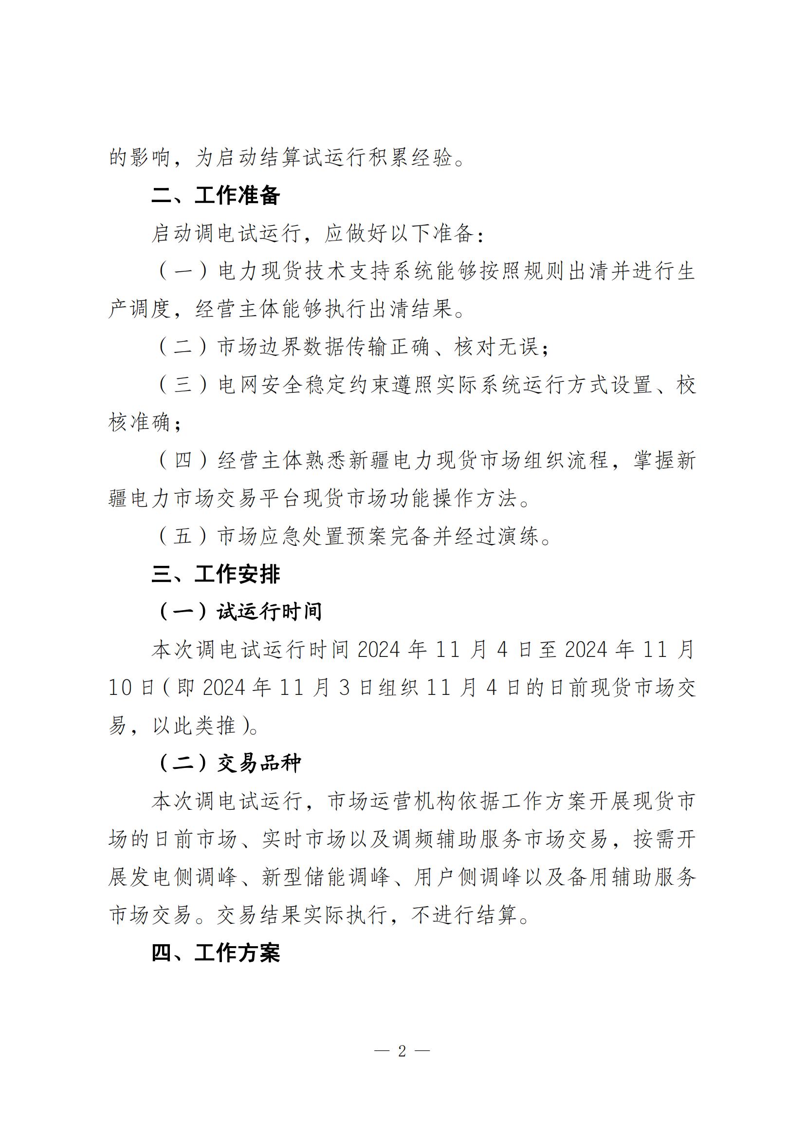 為深入貫徹落實《國家發展改革委辦公廳、國家能源局綜合司關于進一步加快電力現貨市場建設工作的通知》(發改辦體改〔2023〕813號)等文件精神,加快適應全國統一電力市場體系構建,穩步推進新疆電力現貨市場建設,結合新疆實際情況,在前期新疆電力現貨市場調電試運行和模擬聯調的基礎上,依據《自治區發展改革委關于同意開展新疆電力現貨市場調電試運行的復函》要求,自2024年11月4日至11月10日,市場運營機構按照《新疆電力現貨市場調電試運行工作方案》開展新疆電力現貨市場調電試運行交易組織工作,請各經營主體遵照執行。