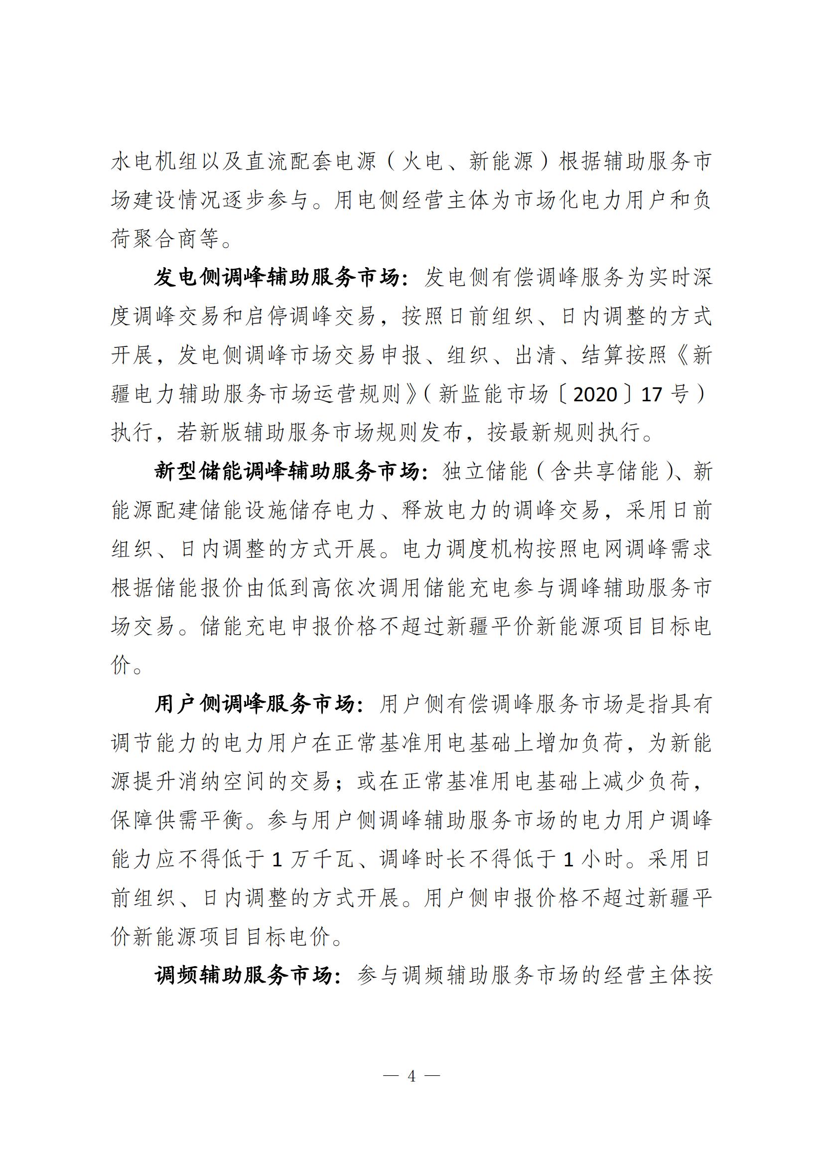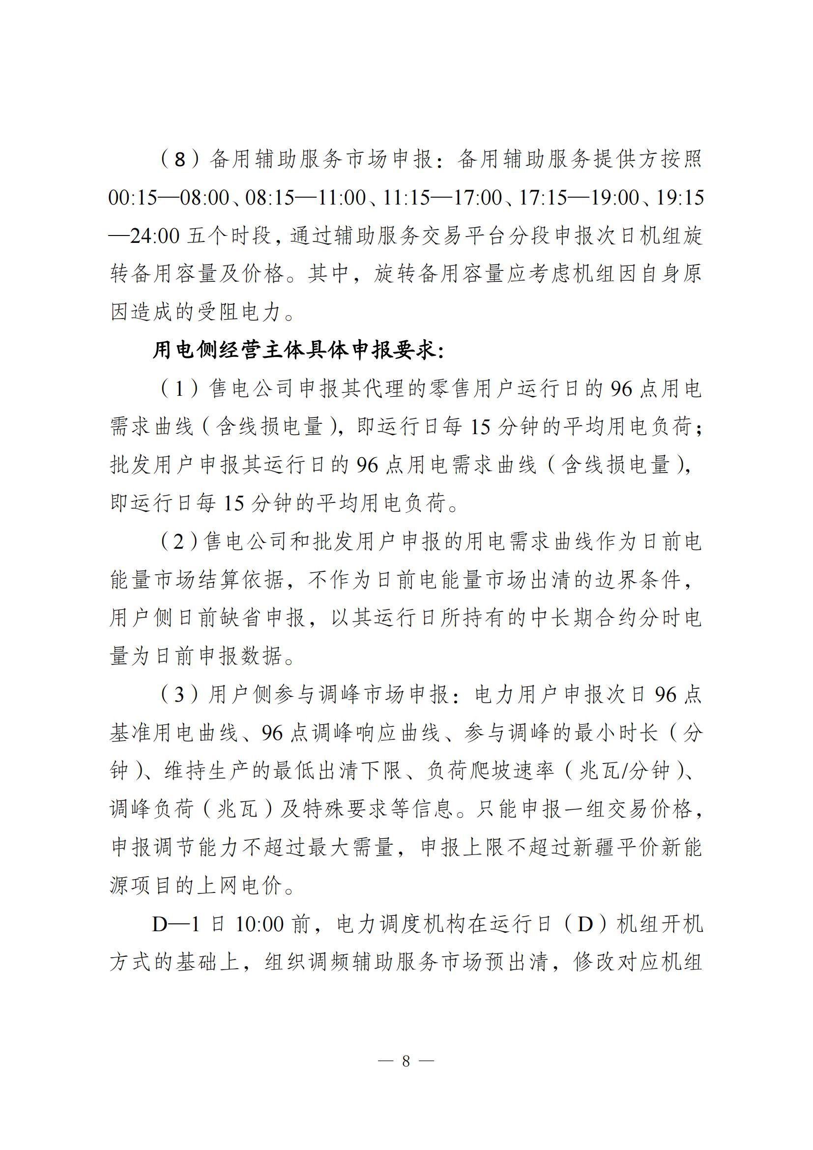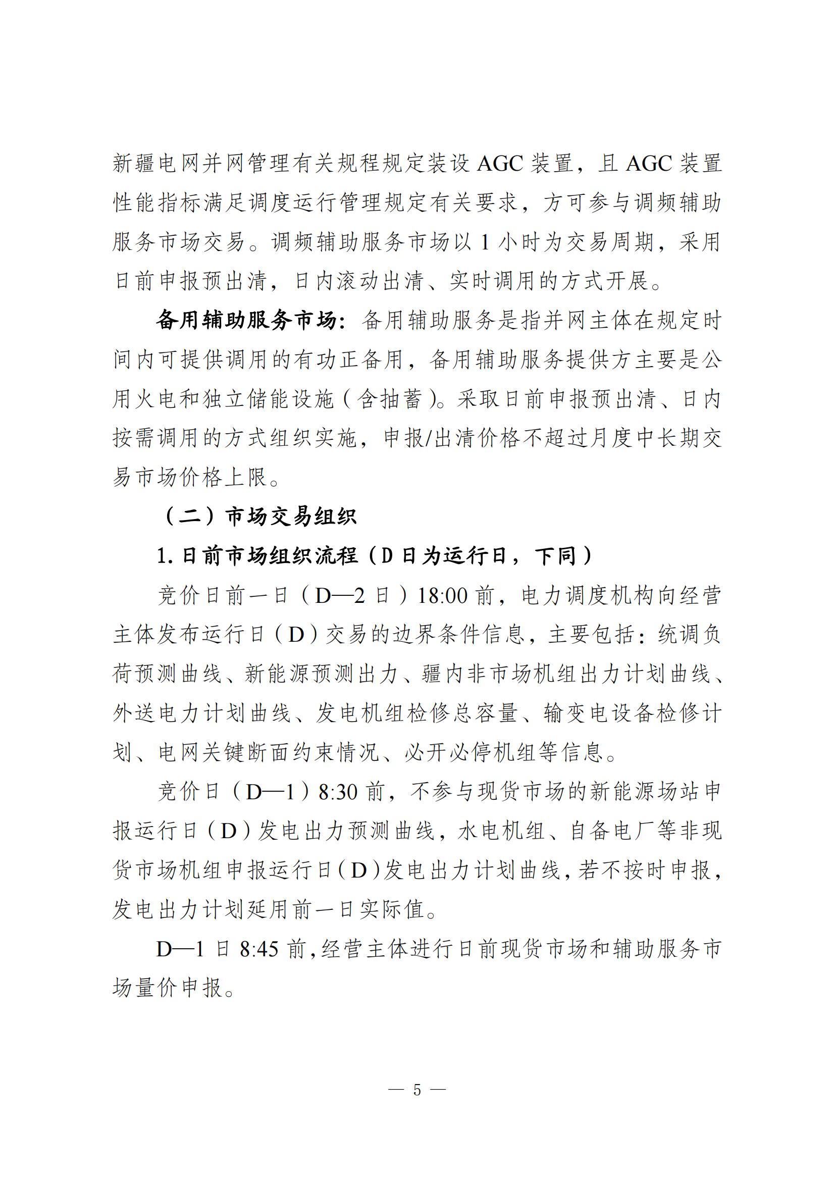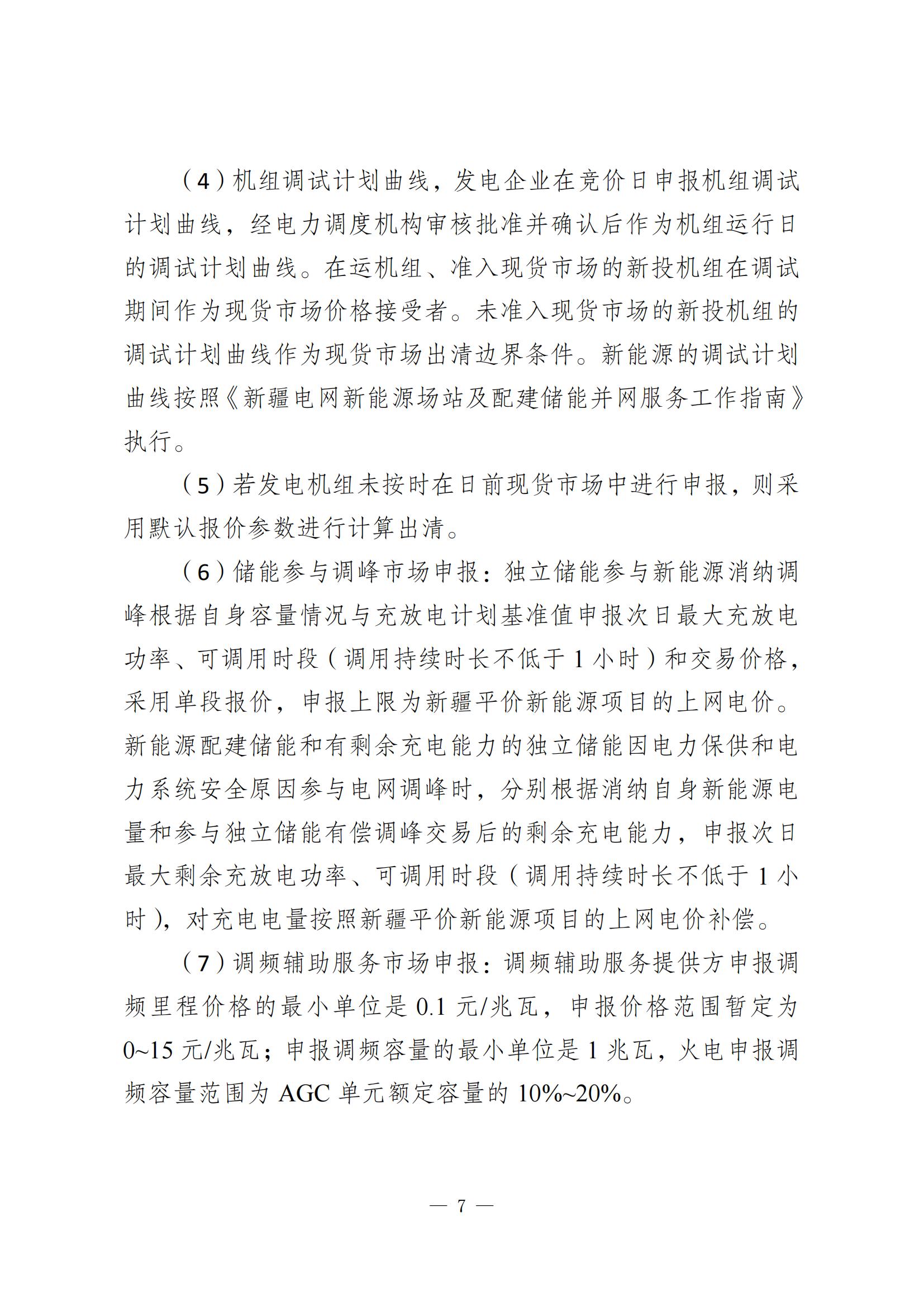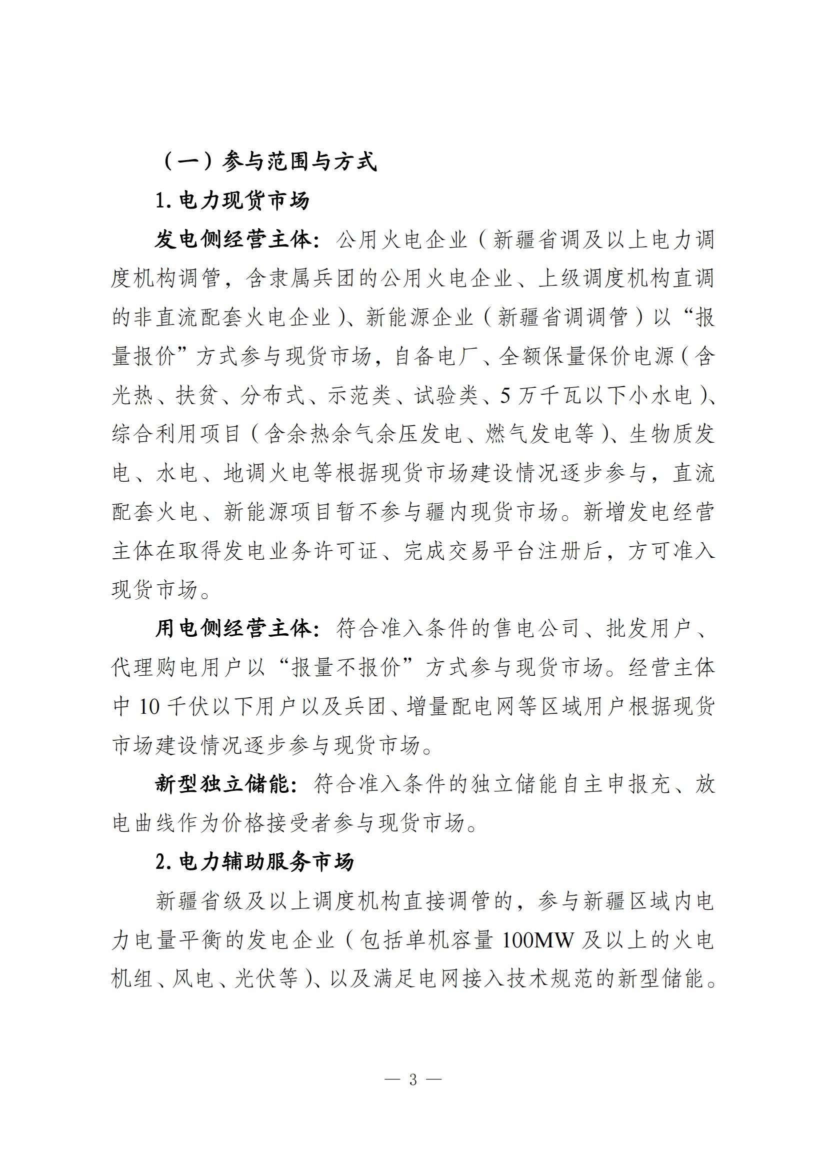 其中提到,公用火電企業(新疆省調及以上電力調度機構調管,含隸屬兵團的公用火電企業、上級調度機構直調的非直流配套火電企業)、新能源企業(新疆省調調管)以“報量報價”方式參與現貨市場,自備電廠、全額保量保價電源(含光熱、扶貧、分布式、示范類、試驗類、5萬千瓦以下小水電)綜合利用項目(含余熱余氣余壓發電、燃氣發電等)、生物質發電、水電、地調火電等根據現貨市場建設情況逐步參與,直流配套火電、新能源項目暫不參與疆內現貨市場。新增發電經營主體在取得發電業務許可證、完成交易平臺注冊后,方可準入現貨市場。