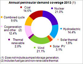 由于最近幾年的經濟下滑,西班牙的電力需求2013年同比再度下跌2.1%,這是第二次年度用電量下滑。同時,西班牙2013年還出口了6.96GWh的凈電力,占總用電需求的2.8%,其中摩洛哥是最大的出口目的地。