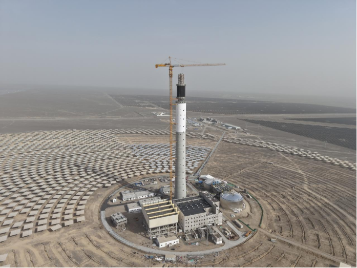據中國能建西北院消息,近日,中國能建西北院總承包的唐山海泰100兆瓦塔式光熱項目吸熱器管屏吊裝全部完成。