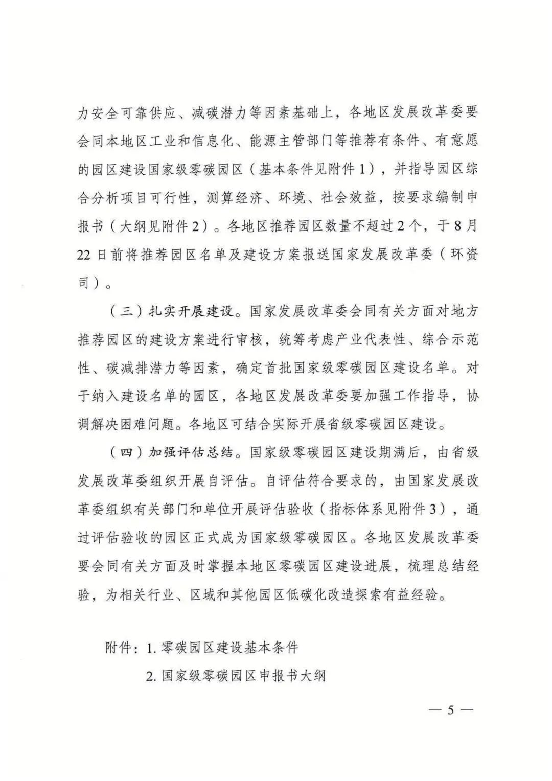 《通知》指出,支持有條件的地區率先建成一批零碳園區,國家發改委將在試點探索、項目建設、資金安排等方面對零碳園區建設給予積極支持。各地區發展改革委要會同本地區工業和信息化、能源主管部門等推薦有條件、有意愿的園區建設國家級零碳園區。各地區推薦園區數量不超過2個,于8月22日前將推薦園區名單及建設方案報送國家發展改革委。