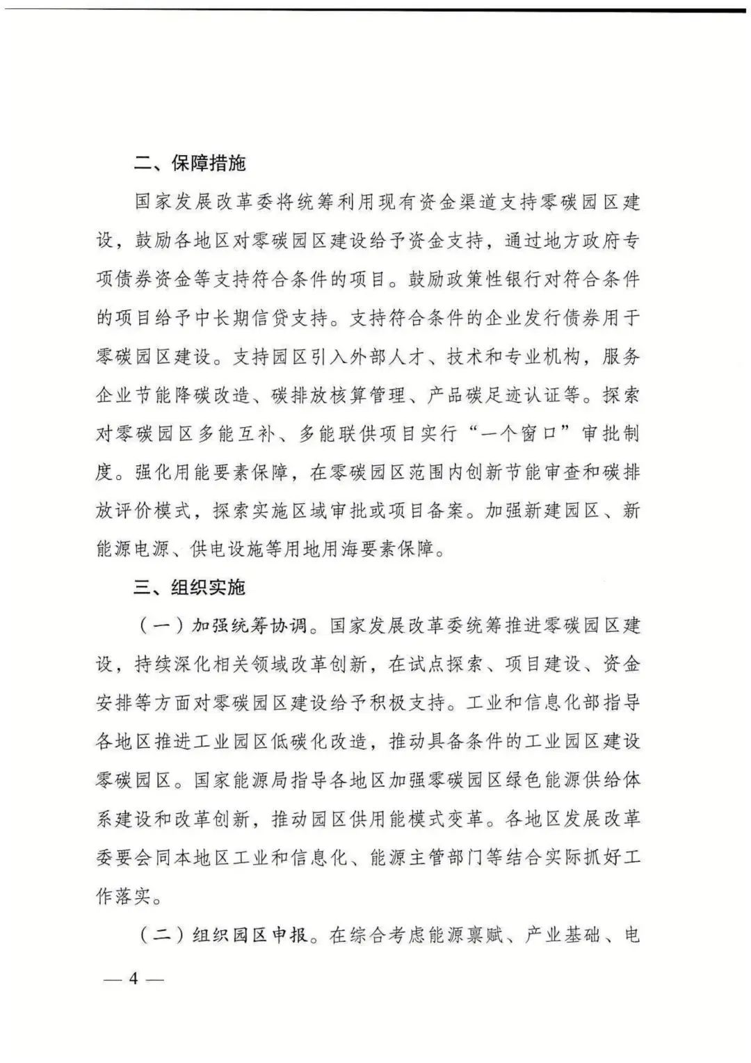 國家發展改革委將統籌利用現有資金渠道支持零碳園區建設,鼓勵各地區對零碳園區建設給予資金支持,通過地方政府專項債券資金等支持符合條件的項目。鼓勵政策性銀行對符合條件的項目給予中長期信貸支持。支持符合條件的企業發行債券用于零碳園區建設。支持園區引入外部人才、技術和專業機構,服務企業節能降碳改造、碳排放核算管理、產品碳足跡認證等。探索對零碳園區多能互補、多能聯供項目實行“一個窗口”審批制度。強化用能要素保障,在零碳園區范圍內創新節能審查和碳排放評價模式,探索實施區域審批或項目備案。加強新建園區、新能源電源、供電設施等用地用海要素保障。