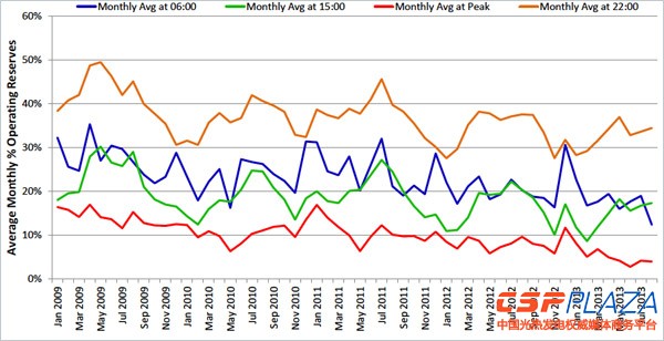 下表1顯示了2009年以來南非每天四個不同時間(上午六點、下午三點和晚上10點以及用電高峰期)的月均額外電力儲備裝機。伴隨電力需求的增加,電力儲備裝機的份額逐漸減少。如果此時需求進一步增加,或某大型發電廠遇到故障無法供電,電力系統將出現供求失衡。