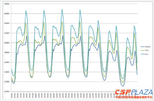 夏季存在一個晚高峰,負荷曲線相對平滑,但相比冬季出現的時間要晚一些,且持續時間較短。另一方面,夏季早高峰相對冬季的需求明顯減少甚至沒有早高峰。下表2顯示了冬季和夏季的典型電力需求情況,表3反映了3月、5月和7月份真實的電力需求曲線。冬季兩個用電高峰十分明顯,其它季節則如3月和5月的電力曲線一樣,只有晚高峰,早高峰并不明顯。