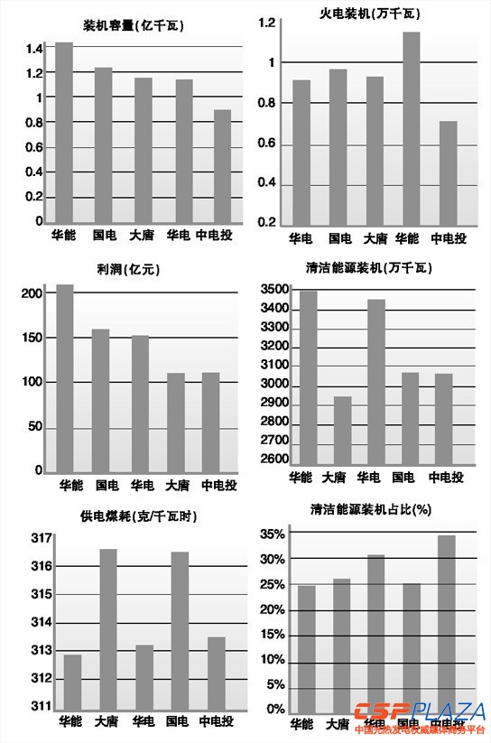 從各自容量座次上看,各集團座次與2012年相同。其中,華能以1.42億千瓦居首;國電1.23億千瓦居第二;大唐與華電極為接近,分別為1.15億和1.13億千瓦,位列三、四名;中電投第五,容量也已達到9000萬千瓦。