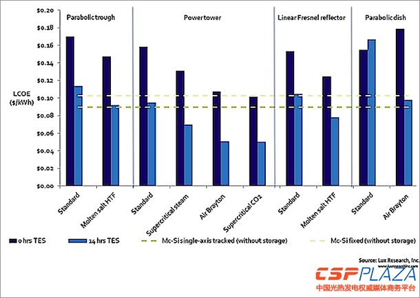 CSPPLAZA光熱發電網訊:知名研究咨詢公司Lux Research日前發布了一份光熱發電的研究報告,名為“Turning Up the Heat on Advanced Concentrating Solar Components”,Lux就此發布的摘要稱,雖然光熱發電市場最近幾年來一直在承受光伏成本的迅速下跌帶來的沉重打擊,但其仍將在未來幾年實現強勢反彈,到2020年,其平準化電力成本(LCOE)將有望比晶硅光伏最高降低33%,與晶硅光伏相抗衡。