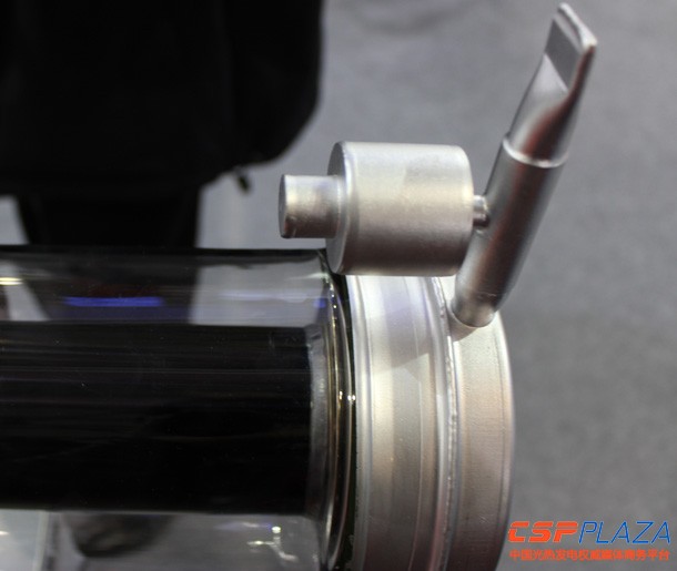 匯銀作為有外資和以色列Solel技術背景的國產集熱管廠商參與了本次展會,并展出了一根2米長的集熱管,其顯著特征在于采用了一種特殊的吸氣劑設置,即將吸氣劑外置于集熱管端部,而常見的集熱管吸氣劑通常置于集熱管的波紋管內側或鋼管內管部位,據匯銀相關人員向CSPPLAZA記者介紹,采用這種設計的優勢是減少了波紋管的長度,增加了集熱管的有效利用長度。