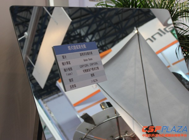 瑜陽光能在本次展會上展出了兩項新產品,其中展出的塔式微弧鏡為一種雙曲鋼化聚光鏡,據相關技術人員對本網記者透露,該微弧鏡通過熱彎鋼化一次雙曲面成型技術制造,具有較高的技術難度,瑜陽光能自去年開始對該產品進行了長達一年的試驗生產,目前該產品已完成定型。塔式微弧鏡可以幫助塔式電站實現更精準高效的聚光效果,是未來塔式反射鏡的技術方向。