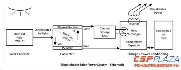 RayGen的CSPV技術集合了光熱發電可廉價存儲、光伏發電成本較低的雙重優勢。750倍的聚光能量照射在高效聚光太陽能電池板上,一平方米的電池板可產出的電能是同等面積的普通電池板的1500倍。置于塔頂的能量吸收器分為兩個部分,上層部分為熱量吸收器,主要吸收紅外輻射,下層部分為聚光光伏電池板,主要吸收可見光發電。吸收的熱量存入儲熱系統,聚光光伏電池發出的電能用壓縮機來壓縮空氣存入壓縮空氣罐中,發電時釋放壓縮空氣中的空氣驅動空氣透平發電,同時利用儲熱系統加熱空氣,空氣受熱膨脹做功,發電效率大幅提升。