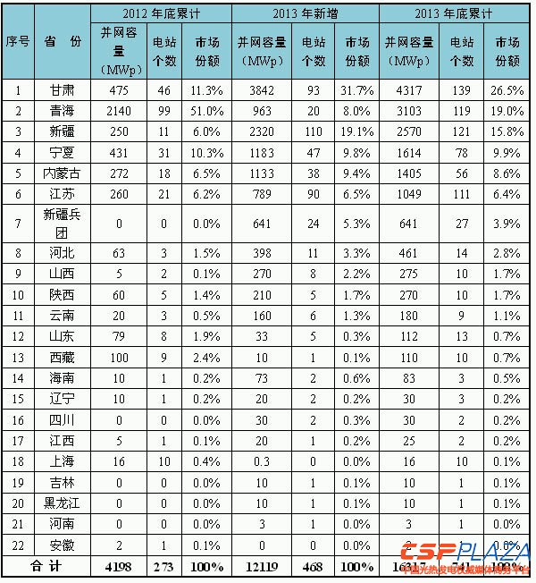 光伏電站。截至2013年底,全國22個主要省(自治區、直轄市)已累計并網741個大型光伏發電項目,主要分布在我國西北地區。累計裝機容量排名前三的省份分別為甘肅省、青海省和新疆自治區,分別達到432萬千瓦、310萬千瓦和257萬千瓦,三省(區)之和超過全國光伏電站總量的60%。各省(自治區、直轄市)光伏電站裝機情況見附表1。