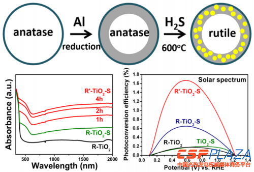 黑色硫摻雜金紅石相二氧化鈦制備示意圖、吸收光譜和光電轉換(JACS 2013)