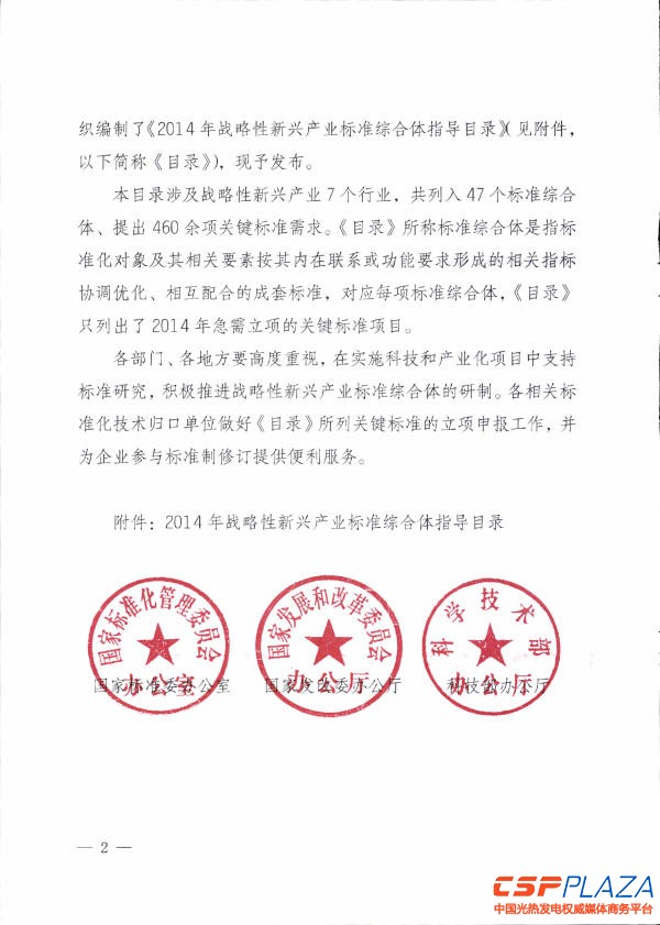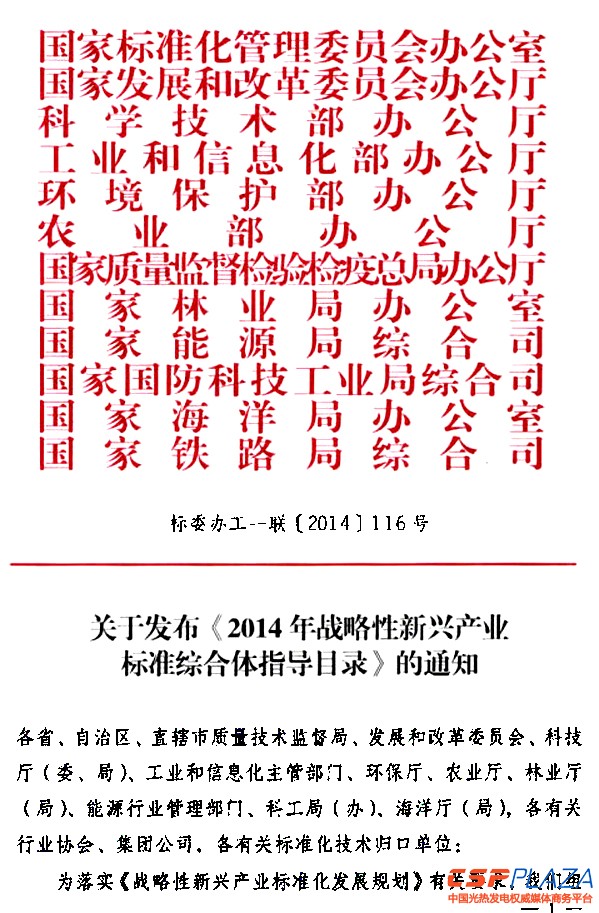 CSPPLAZA光熱發電網訊:CSPPLAZA記者獲悉,2014年6月3日上午,國家標準化管理委員會、國家發展和改革委員會、科學技術部和國家環保部等12家國家機構共同發布了《2014年戰略性新興產業標準綜合體指導目錄》(以下簡稱目錄),其中“槽式太陽能熱發電熱力系統標準綜合體”赫然在列。