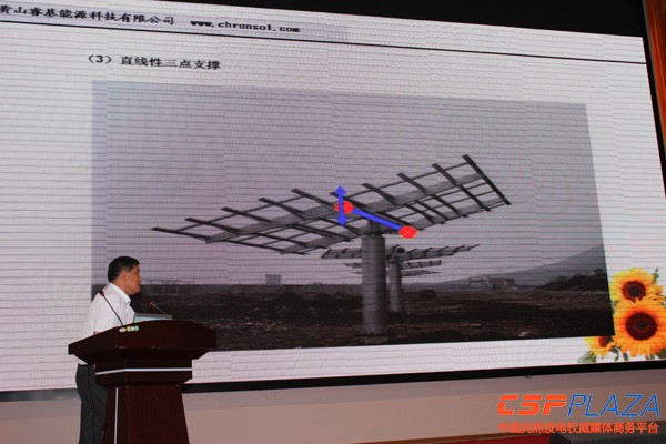 會上,嘉賓和企業代表就世界太陽能光熱發電現狀、國際太陽能發電方式、全球太陽能光熱發電現狀及未來發展方向、分布式太陽能光熱發電系統、高精度雙軸跟蹤系統與槽式跟蹤系統在光熱方面的應用、彈性波紋管在太陽能中高溫集熱管領域的應用、易簡型菲涅爾聚光集熱系統簡介與商業推廣價值、螺桿機在熱發電行業中的應用、光熱電站電線電纜解決方案等有關問題進行了深入交流探討。13日,與會人員就光熱發電成功案例進行了分析和交流,并就行業發展中的有關問題探討。會后與會代表們參觀黃山金普森股份有限公司的雙軸回轉跟蹤系統生產車間和太陽能海水淡化項目。據黃山金普森股份有限公司董事長顧全軍介紹,該太陽能海水淡化項目采用自主研發的先進技術和產品,保證技術領先水平的同時,進一步降低了成本。如此以來,太陽能海水淡化與其他的方式比較就相當具有競爭力。