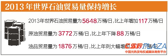 《統計》顯示,2013年世界石油貿易量為5648萬桶/日,比上年增加117萬桶/日,增幅為2.1%。其中,原油貿易量為3772萬桶/日,下降88萬桶/日;油品貿易量為1876萬桶/日,大