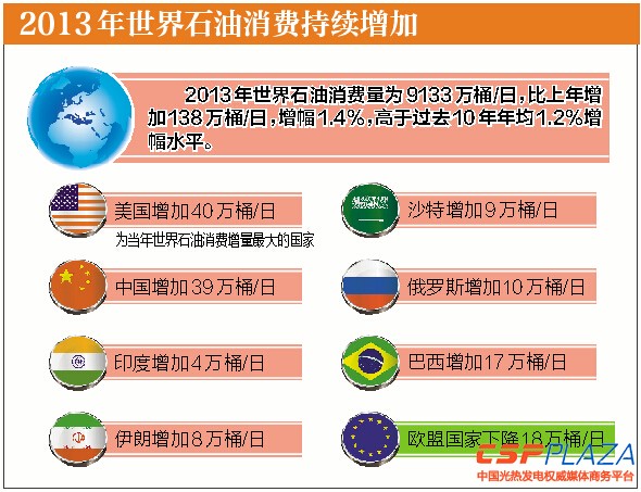 2013年,世界經濟增長繼續拉動石油消費水平不斷提高。《統計》顯示,2013年世界石油消費量為9133萬桶/日,比上年增加138萬桶/日,增幅1.4%,高于過去10年年均1.2%增幅水平。