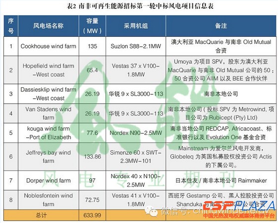 2011年12月,第一輪風電中標8個項目,合計容量為63.4萬千瓦,中標價格全部為允許的最高投標基礎電價1.14蘭特/千瓦時(約合人民幣0.69元/千瓦時),其中中國風電機組制造廠商華銳風電作為設備供應方參與兩個項目,共提供生產18臺3兆瓦機組,為首先登陸南非市場的中國風電機組制造商。