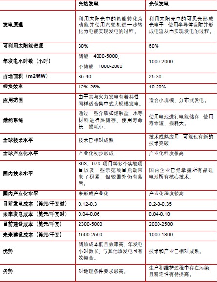 作為同樣都是利用太陽能進行發電的可再生能源技術,光伏發電無疑是最經常用來與太陽能光熱電做比較的新型發電技術。我們認為,光伏發電主要應用于分布式發電,而光熱發電則較多用作集中式發電。因此兩者長期來看是互補關系。