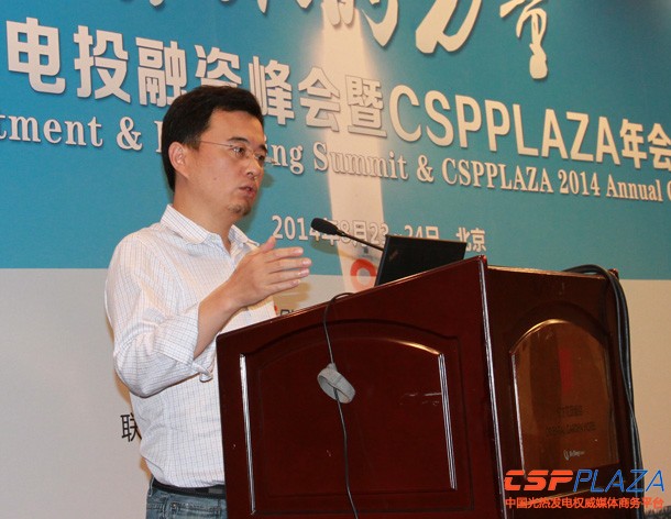 CSPPLAZA光熱發電網報道:8月23~24日,CSPPLAZA聯合中海陽集團在京組織召開了中國光熱發電投融資峰會暨CSPPLAZA年會2014,上海晶電新能源有限公司總經理陳煜達在會上對該公司潛心多年研發的二次反射塔式光熱技術以及該公司新疆100MW塔式項目進行路演推介。