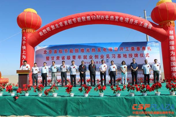 敦煌市委常委、常務副市長茍小衛在致辭中強調,“敦煌市規劃到2020年建成550萬千瓦太陽能發電裝機,其中光熱發電裝機50萬千瓦。此次首航節能開工建設10MW光熱發電項目,使敦煌實現了光熱發電裝機零的突破,將有效帶動敦煌光熱發電產業做大做強。”