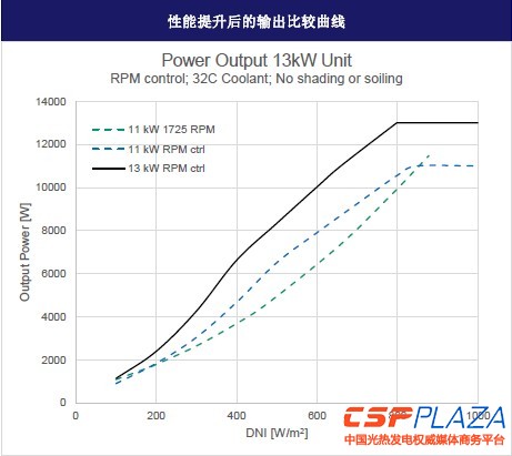 下一步我們準備開發13KW的斯特林發動機,基于11kW發電機的模型,同時包括了最新的技術升級。通過增加輸出來降低設備的單位造價成本。很重要的性能提升是將冷卻系統升級為雙回路冷卻系統,這將使得斯特林發動機冷端的氣體溫度進一步降低,從而提升了其效率。 下圖中非線性的波形的性能提升主要是采用了自動軸轉速控制功能,這樣在DNI低的時候發電機的轉速會相應降低,其效率會隨之升高。 13kW的發動機也使得在高DNI的時候,其輸出更多。