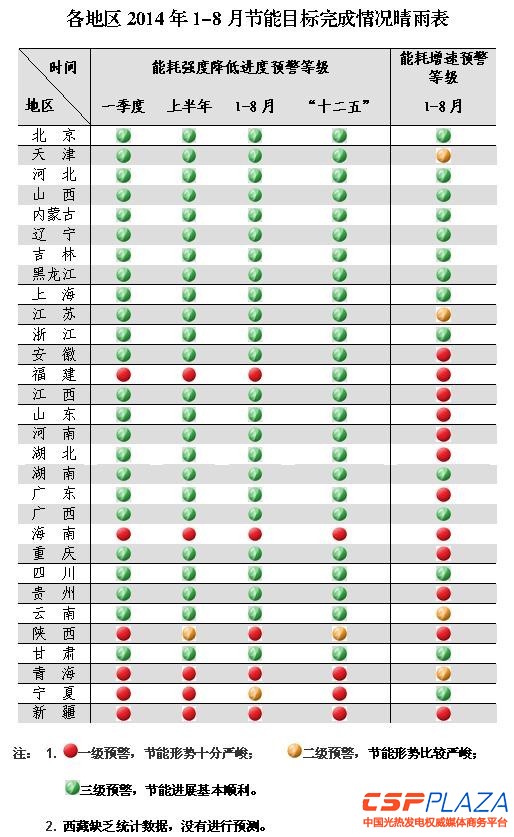 近日,國家發布了各地區2014年1-8月節能目標完成情況晴雨表。通過對各地區節能形勢進行分析,對照各地“十二五”年均節能任務,1-8月,福建、海南、陜西、青海、新疆等5個地區預警等級為一級,節能形勢十分嚴峻;寧夏預警等級為二級,節能形勢比較嚴峻;北京、天津、河北、山西、內蒙古、遼寧、吉林、黑龍江、上海、江蘇、浙江、安徽、江西、山東、河南、湖北、湖南、廣東、廣西、重慶、四川、貴州、云南、甘肅等24個地區預警等級為三級,節能工作進展基本順利。西藏缺乏統計數據,沒有進行預測。與上半年相比,陜西由二級預警上升為一級預警,寧夏由一級預警下降為二級預警。