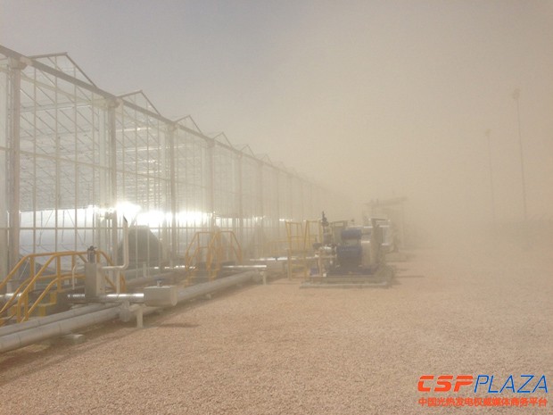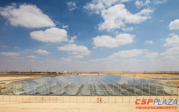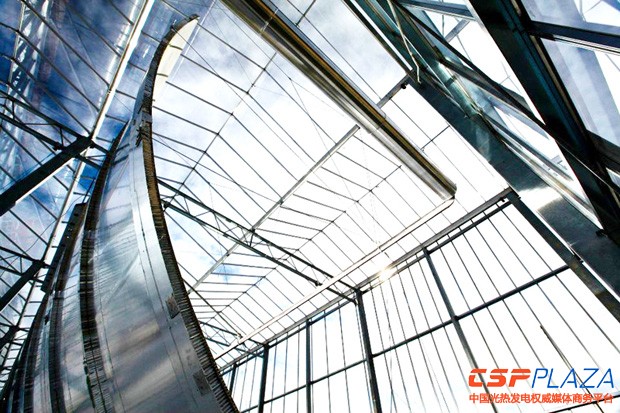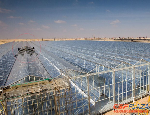 其采用的集熱場設計的最大特點是將太陽能集熱器置于一個類似于玻璃溫室的結構中,即上述的封閉型槽式集熱器,溫室里保持著高于外界的空氣壓力,因此沒有灰塵進入,以抵抗外部大風、沙塵等環境條件對集熱器的影響。這將保證集熱器不會受到外界惡劣環境天氣條件的影響,如中東地區經常發生的沙塵暴等氣候條件。