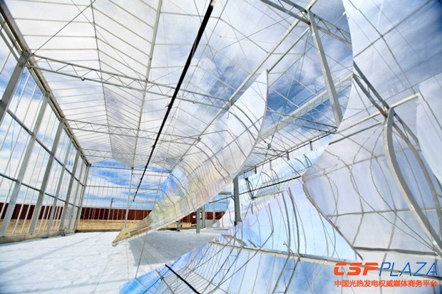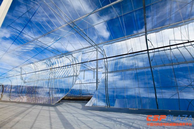 另外,為了保證槽式集熱系統產出足夠壓力的蒸汽,其采用了槽式DSG的技術路線,集熱管并未采用常見的玻璃真空管,而采用了類似于菲涅爾集熱技術用的鍍膜鋼管,這種鋼管可以承受更大的壓力,保證輸出蒸汽達到100bar的壓力水平。同時,由于玻璃溫室的反射等作用將造成一定的陽光透入損失,為更大程度上聚集熱量,其反射鏡采用了7.5m的大開口設計。