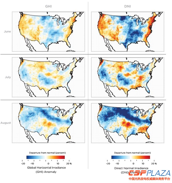 下面這副圖片則向我們展示了美國今年夏天太陽能輻照強度與往年平均值相比的波動情況。