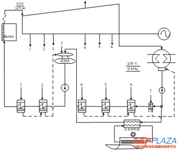 據大唐方面介紹,該項目是在全套引進國際先進槽式光熱技術的基礎上,通過消化吸收再創新,實現自主設計、制造、建設,其關鍵部件如聚光器及跟蹤驅動、高溫導熱油泵等全部為國產化,核心部件集熱管、反射鏡則釆用國產與進口產品同場運行,作參數對比。重點研究并解決將槽式太陽能集熱與燃煤機組互補發電系統集成技術、規模化太陽能熱高效傳輸技術、槽式太陽能集熱與燃煤機組互補發電系統的運行模式與調節技術,使得太陽能集熱場、換熱系統及燃煤機組能在各種氣象條件下穩定運行,實現不同工況順利切換。利用太陽能集熱系統輸出熱量與燃煤機組熱力系統耦合,以油水換熱器為熱交換樞紐將太陽能熱量輸入燃煤機組熱力系統取代部分燃煤熱量,從而實現太陽能熱發電的目的。