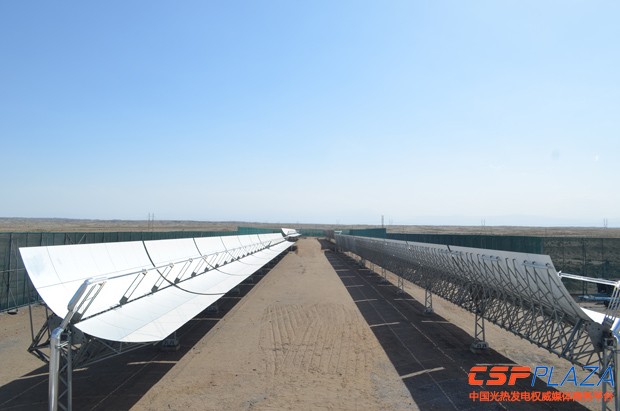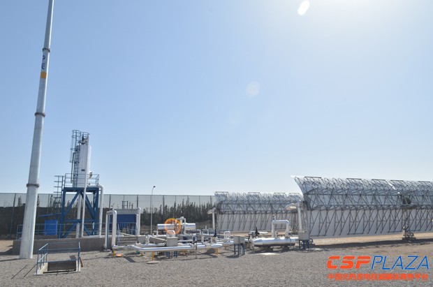 該示范項目位于甘肅嘉峪關大唐803燃煤電廠廠區,容量為1.5MWth,占地面積3.5萬平方米,采用槽式太陽能熱發電技術。在600米長的太陽能集熱場內,導熱油流經集熱管加熱至393℃,通過油水換熱器將高溫導熱油的熱量接入大唐八零三發電廠熱力系統。以光煤互補發電的方式,利用太陽能資源來補充發電,可有效減少原火電機組煤耗量,降低污染排放,實現連續穩定發電。目前,在運行狀態下,光場出口溫度可以穩定達到393℃,太陽跟蹤、聚光、集熱各系統工作正常,光場核心部件高溫集熱管、槽式反射鏡、支架系統均工作正常。現場將繼續對對系統各部件的穩定性和可靠性進行驗證測試,為規模化開發提供技術支撐。