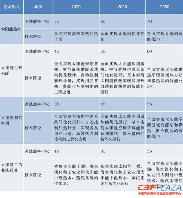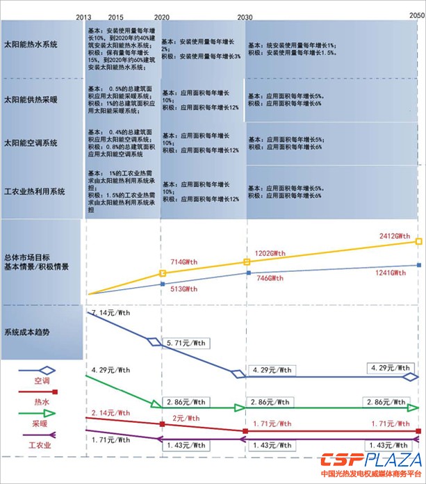 圖:太陽能熱利用發展路線圖(Wth 為熱裝機容量單位,每平米太陽能集熱器相當于裝機容量700Wth)