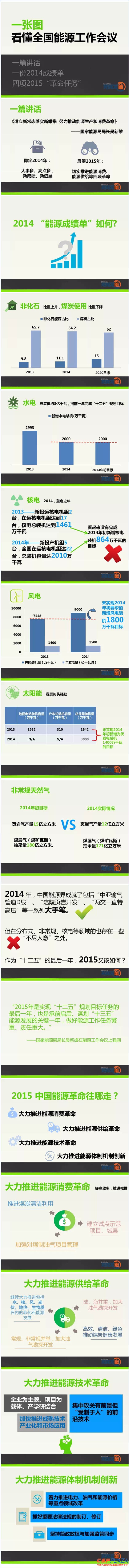 國家發展改革委主任徐紹史出席會議并作重要講話,國家能源局局長吳新雄在會上作題為“適應新常態落實新舉措努力推動能源生產和消費革命”的報告。想知道2014中國能源發展總體情況如何?2015的能源革命大方向又將如何?一張圖就夠了!