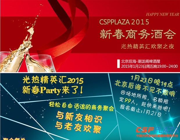 光熱精英匯2015新春Party來了!CSPPLAZA光熱精英匯2015新春商務酒會即將于2015年1月23日晚在北京后海潮瀧閣啤酒屋舉辦,輕松自由活潑的商務聚會,與新友相識、與老友歡聚!名額有限,趕快來搶吧!