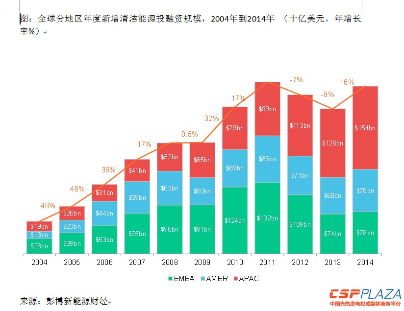 彭博新能源財經(BNEF)近日發布年度數據報告稱,2014年全球清潔能源投資總額達到3100億美元,相較2013年的2681億美元增長了16%,較2004年的602億美元增長逾5倍,但與2011年的歷史最高記錄3175 億美元相比仍低 2%。2014年,全球風能和太陽能新增裝機容量均創下歷史紀錄,總規模約為100吉瓦。相對于2011年安裝的69.5吉瓦,目前每吉瓦的項目造價顯著降低。