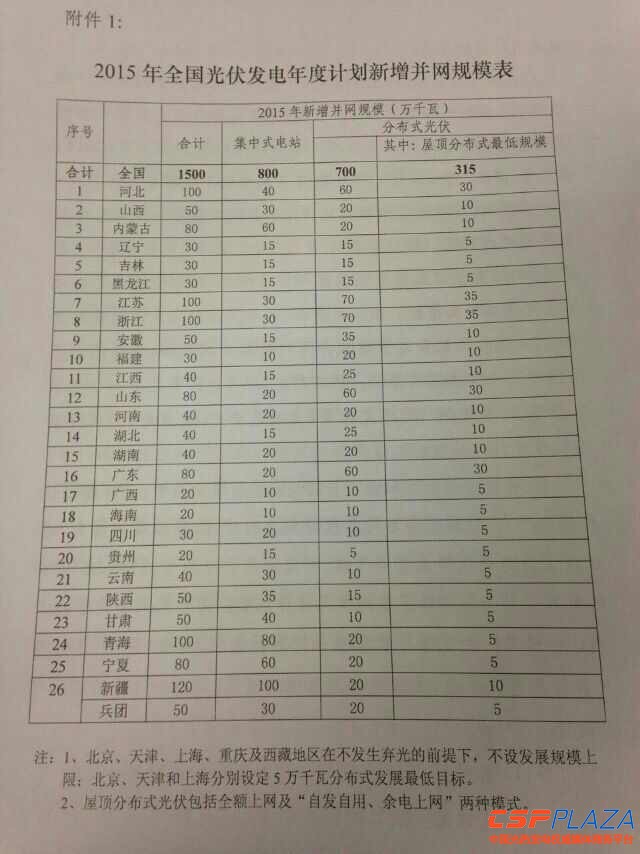 CSPPLAZA光熱發電網訊:國家能源局日前下發《2015年度全國光伏年度計劃新增并網規模表》征求意見。根據征求意見稿,能源局計劃2015年全國新增并網規模15GW,其中集中式電站8GW,分布式7GW(其中屋頂分布式不低于3.15GW)。