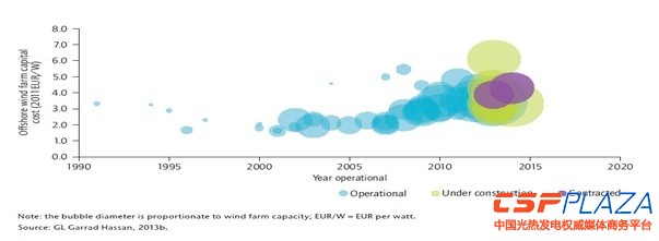 海上風電風速高,發電量比陸上風電多50%,這可以部分抵消其較高的投資成本。目前海上風電度電成本在13.6美分-21.8美分/kWh,2010-2012年建設的海上風電項目度電成本仍然高于陸上風電,主要是因為海上風電項目離岸越來越遠,水深越來越深,增加了地基、并網和安裝成本。海上風電項目的融資成本也相對更高。