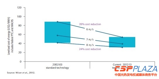 風電度電成本取決于風資源狀況、投資成本、運維成本、融資成本,以及技術進步帶來的容量系數提高情況等。更高的風機和更大的葉片直徑能夠增加捕風量。這些在一定程度上抵消了投資成本的上升,使得現在風電度電成本與2002-2003年的很接近。在某些地區,風電度電成本低于5美分/kWh。