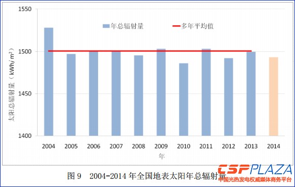 2014年,全國地表平均水平面總輻射年輻照量約為1492.6kWh/m2,較近10年(2004-2013年)平均值偏少約8.1kWh/ m2,為近10年來次小年。