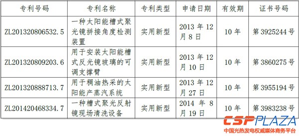 CSPPLAZA光熱發電網訊:首航節能2月12日晚間發布公告稱,近日,北京首航艾啟威節能技術股份有限公司控股子公司首航節能光熱技術股份有限公司于三天前取得一項光熱發明專利證書(《用于槽式光熱電站的槽式聚光器控制系統及其控制方法的發明專利》)之后,再次取得國家知識產權局頒發的《用于稠油熱采的太陽能產蒸汽系統》等四項實用新型專利證書,具體如下: