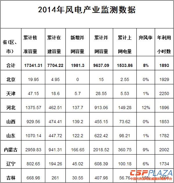 CSPPLAZA光熱發電網訊:2015年1月12日,國家能源局公布了中國2014年風電產業監測情況,詳情如下: