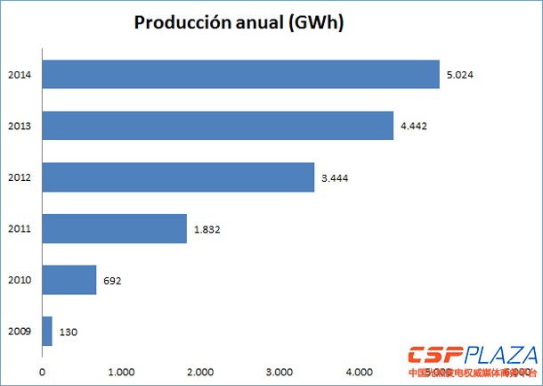CSPPLAZA光熱發電網訊:西班牙光熱發電總發電量在2014年創下新高,達到5013GWh,占當年全國總發電量的2.1%,相對2013年增長13%。