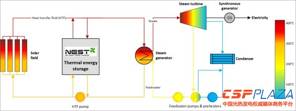 圖:常規導熱油傳熱槽式電站中應用NEST儲熱技術