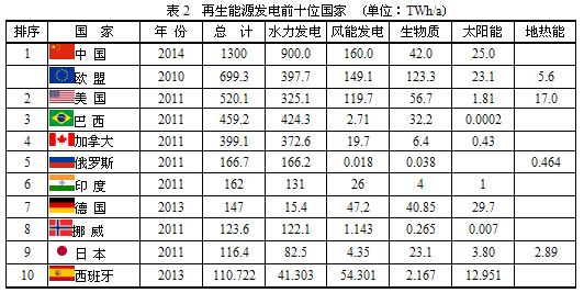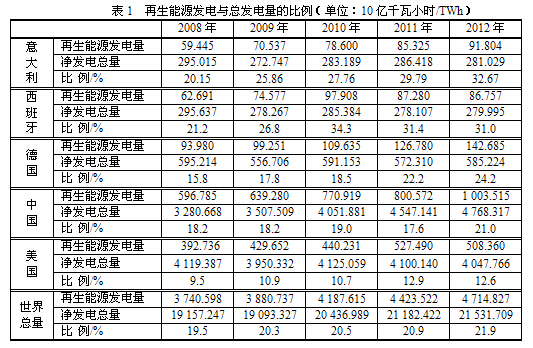 現將美國能源情報署(EIA)公布的數據列于表1,選擇的幾個國家的再生能源發電與總發電量的比例。意大利的比例最高,其次為西班牙、德國;中國只達到世界平均值,但比美國強多了。