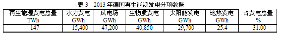 《第三次工業革命》常拿德國說事,請見表3,德國2013年太陽能發電仍然低于風電場和生物質發電。